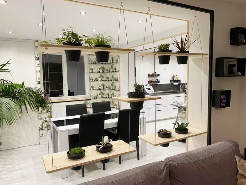 J’ai réalisé une cloison séparative assez originale, avec des montants verticaux en acier noir et des cubes de rangement en pin clair. Le principe : séparer deux espaces tout en laissant passer la lumière et en créant du rangement. Les cubes sont positionnés de façon aérée, un peu comme une bibliothèque suspendue. C’est le genre de projet qui demande de la précision dans les fixations et un bon sens de l’équilibre visuel.
